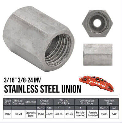 Crafted from 300 series stainless steel, these brake line unions are unmatched in their corrosion resistance. Meaning you will never have to replace a single union due to a short life span. The stainless steel material also makes these unions extremely strong. This added strength gives the unions a high level of durability that is not found in other unions and makes for a more secure connection between brake lines.